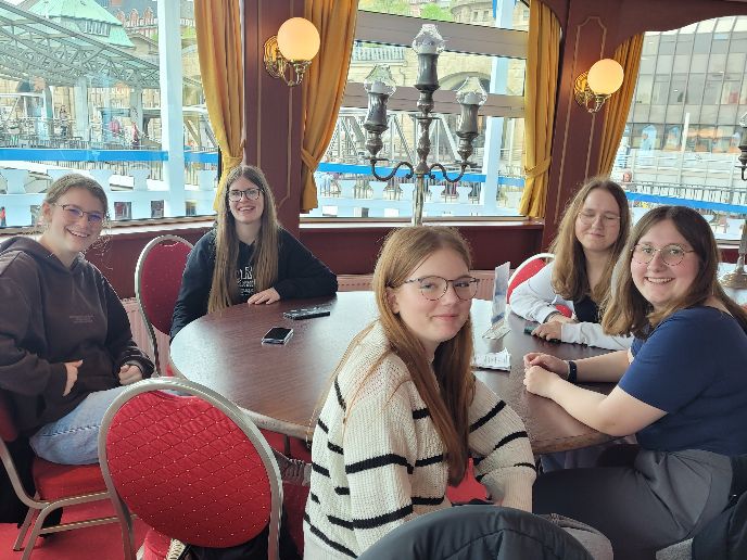 Die Hafenrundfahrt an sich erlebten wir auf einem Schaufelraddampfer. Das Innere erinnerte doch sehr an die Titanic und Franzi, Johanna, Lena, Stella und Abbi reservierten für sich gleich die Poleposition. Auf Deck war auch nicht wenig los, doch da schien das Handy interessanter als der Ausblick (zumindest manchmal).