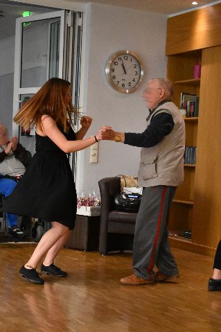 | Ein über 90-jähriger Heimbewohner (aus Datenschutzgründen verpixelt) zeigte zusammen mit Annalena Niehoff eine schwungvolle Tanzeinlage. |