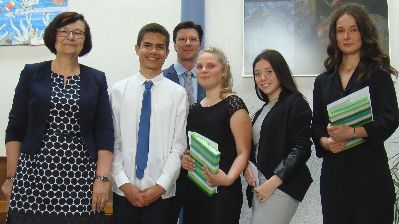 Herr Schröder und Frau Schmidt-Potthast ehrten vier Schüler/innen für besondere Leistungen: Laura Lammert (Bildmitte) erhielt mit einer sagenhaften Durchschnittsnote von 1,1 das historisch beste Zeugnis, das je eine Schülerin an der Rhumetalschule erhielt.