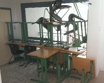 Am letzten Schultag ließen die Abgänger den Blutdruck unseres Hausmeisters kräftig ansteigen, da sie ab 5 Uhr morgens unter Aufsicht äußerst motivierter junger Klassenleitungen Zugänge sperrten sowie Stühle und Tische zur Freude der anderen Schüler stapelten.
