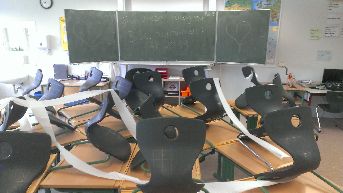 In einem Klassenraum über dem neuen Schulhof wurde laute Musik eingespielt.