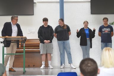 | Herr Brakmann und die Bläserklassen überzeugten mit ihrem Auftritt. | Herr Droldner begrüßte alle Neulinge persönlich. |