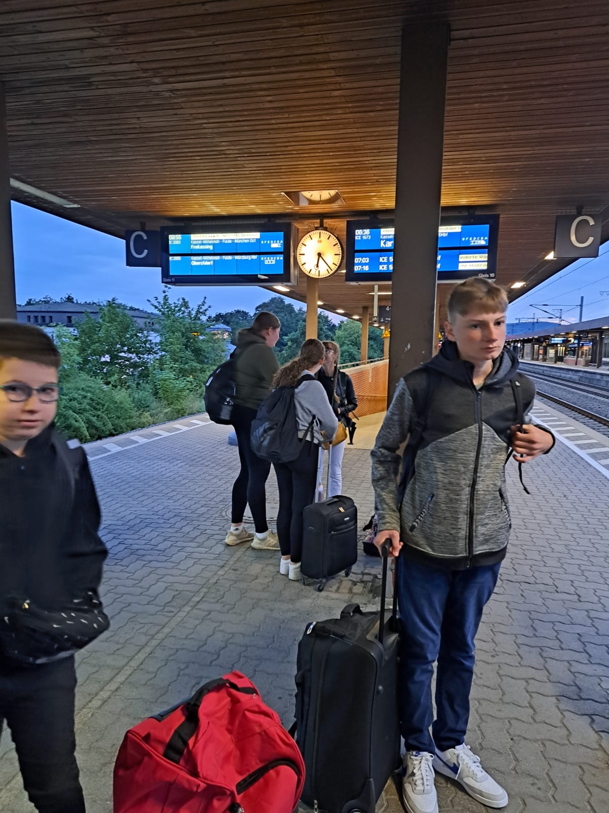 6:35 Uhr mit dem Zug losfuhren, der Gott sei Dank pünktlich kam.