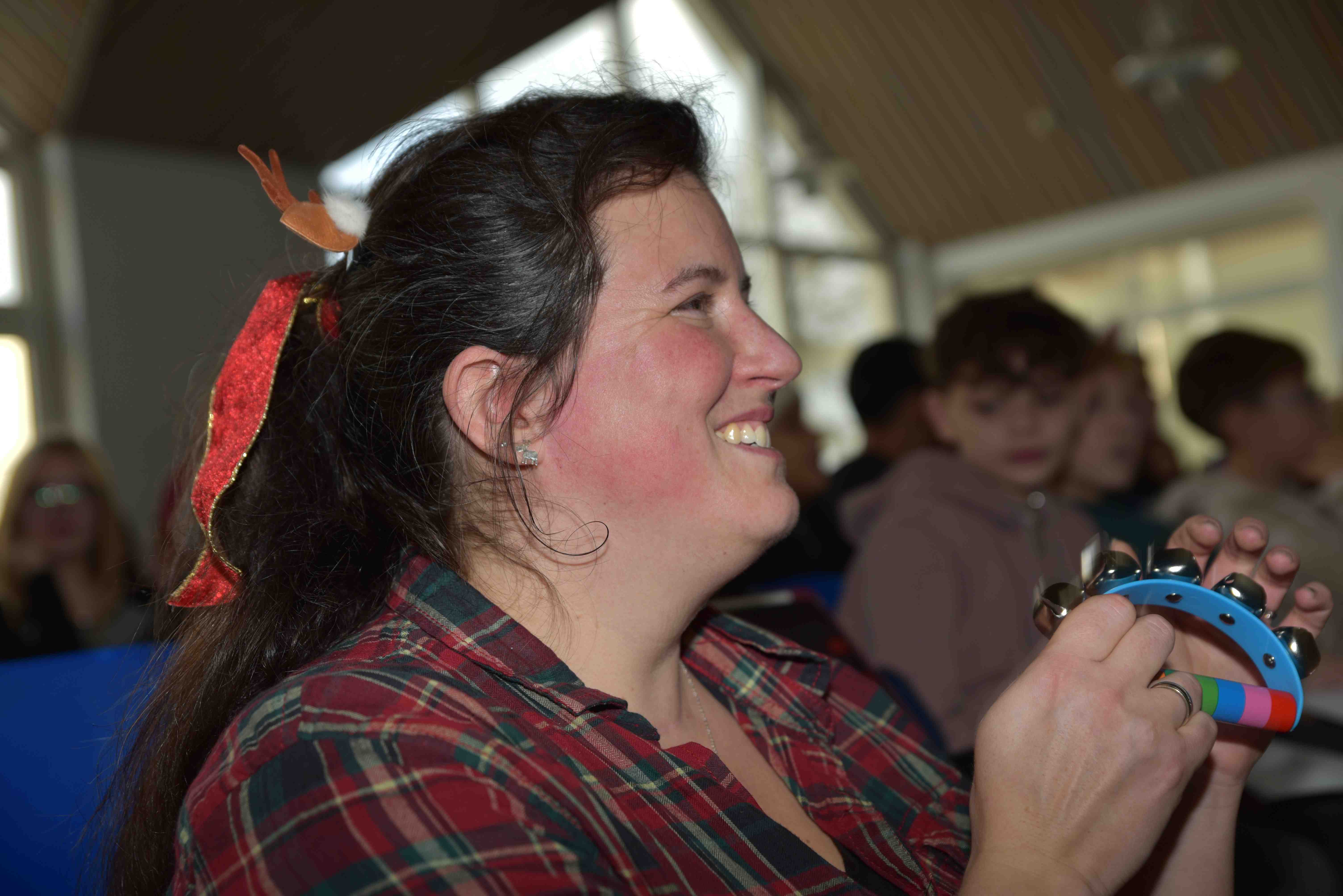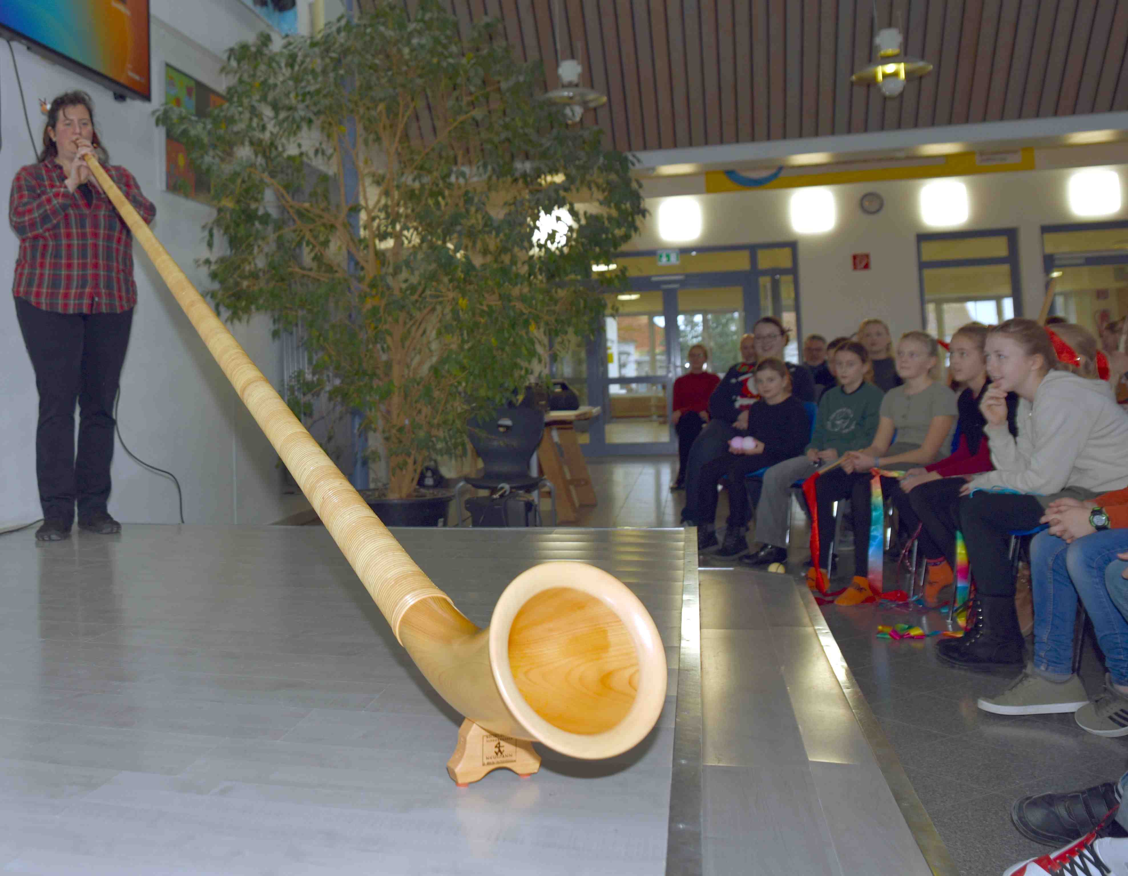 Die Weihnachtsfeier begann mit einem rund vier Meter langen Blasinstrument, einer Alphorn-Einlage von Frau Rehwald. |
