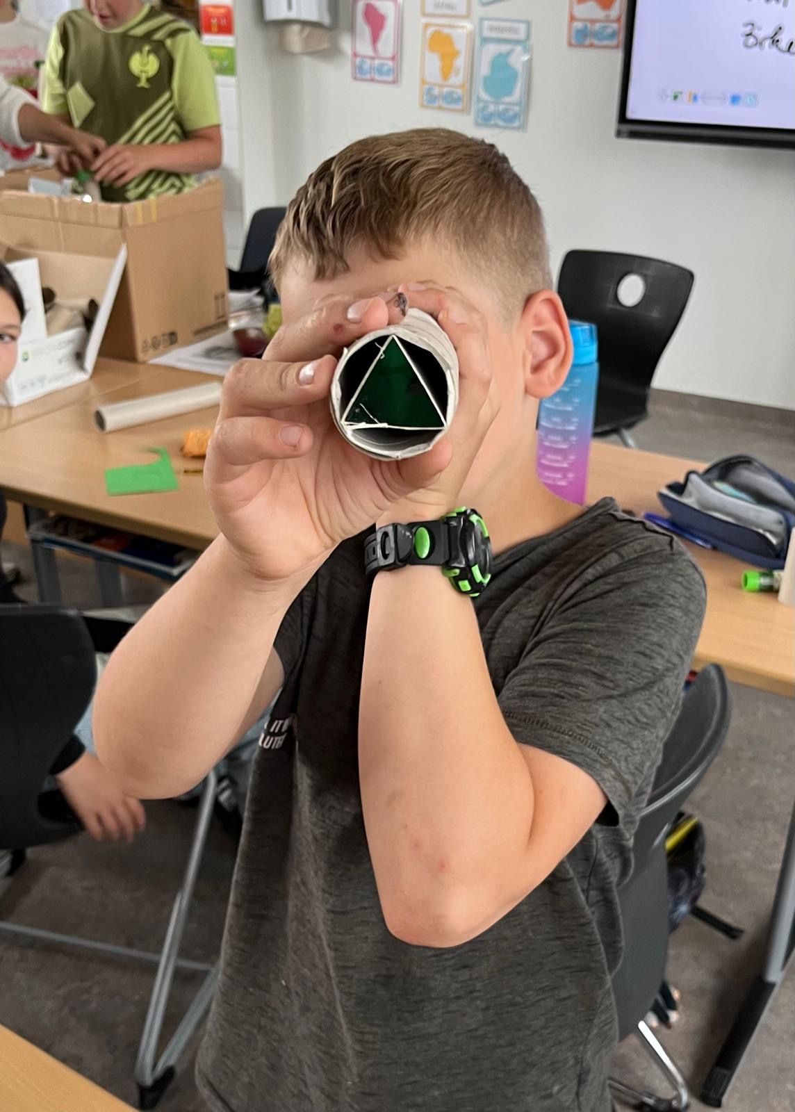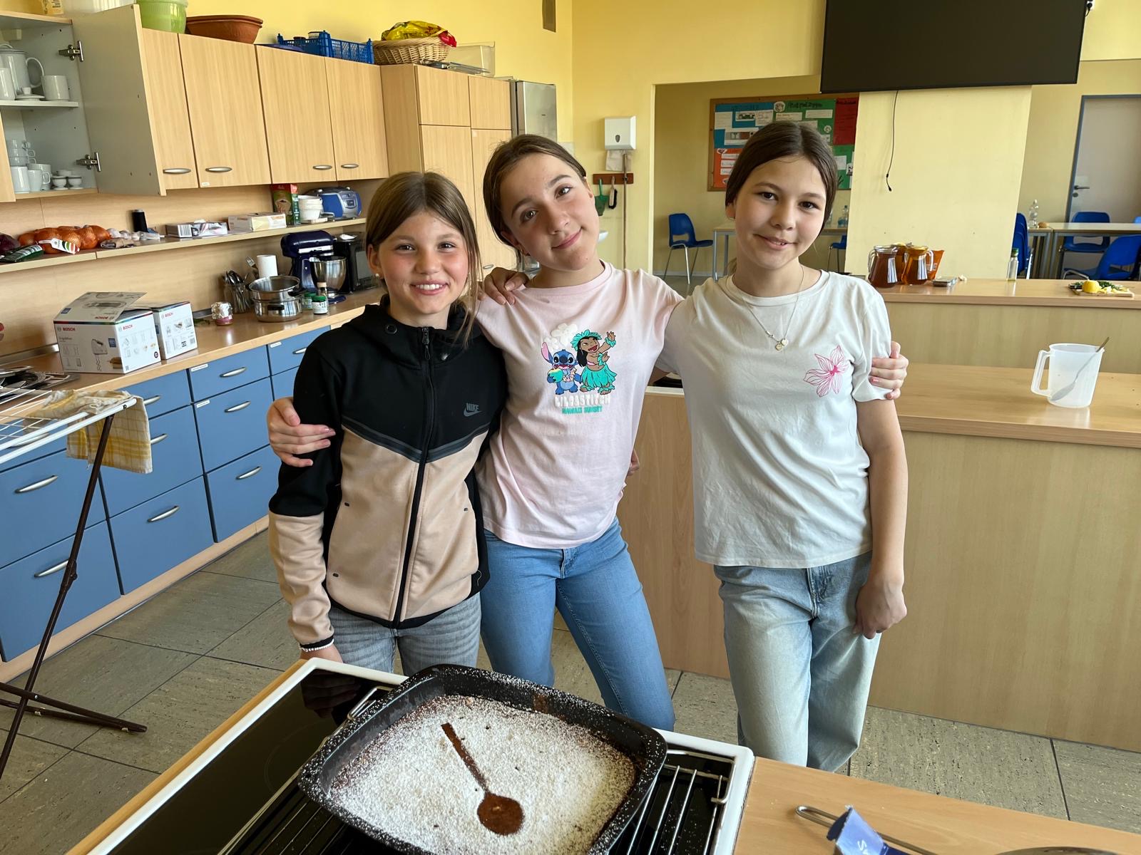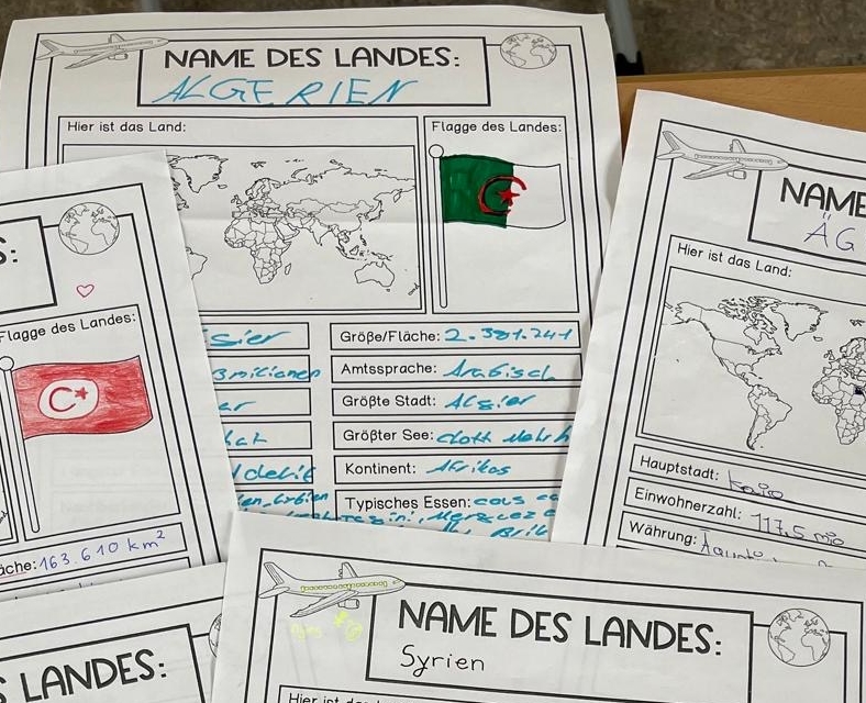 Projekt "1001 Nacht - Zauberhafter Orient": Die Schüler*innen tauchten in die Welt des Orients ein und erfuhren, wie der Orient riecht, schmeckt und sich anhört. Es wurden Informationen zum Orient erarbeitet, orientalische Gewürze entdeckt und Speisen zubereitet sowie ein Kaleidoskop gebaut (v.l. Alissa, Inna und Ava vor ihrem fertigen orientalischen Mandelkuchen, Jannik überprüft sein Kaleidoskop, erarbeitete Steckbriefe). |