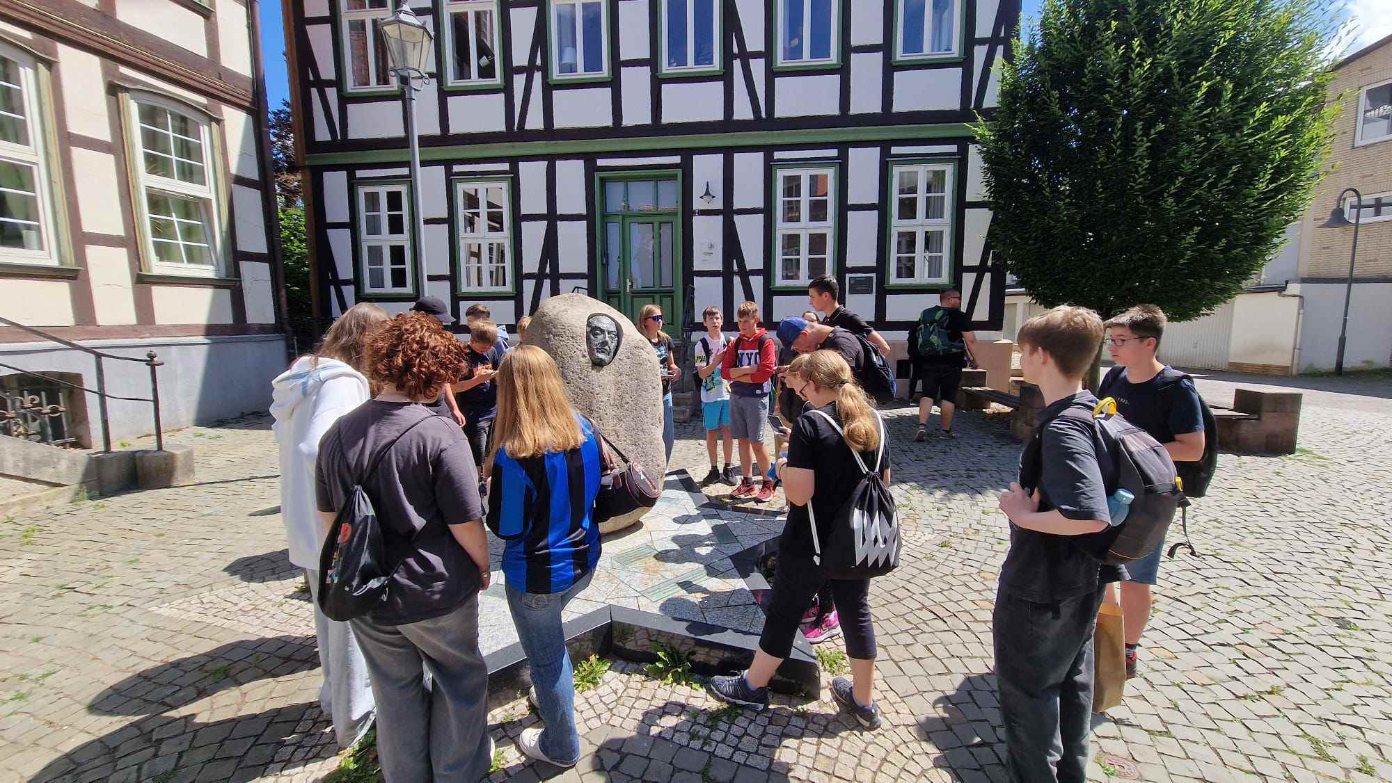 Projekt "Stolpersteinetour": In Northeim und Göttingen wurden u.a. Geocashing-Touren unternommen, Stolpersteine aufgesucht und hierzu eine Ausstellung vorbereitet (l. Holocaust-Denkmal in Northeim, r. Stolpersteine in Göttingen). |