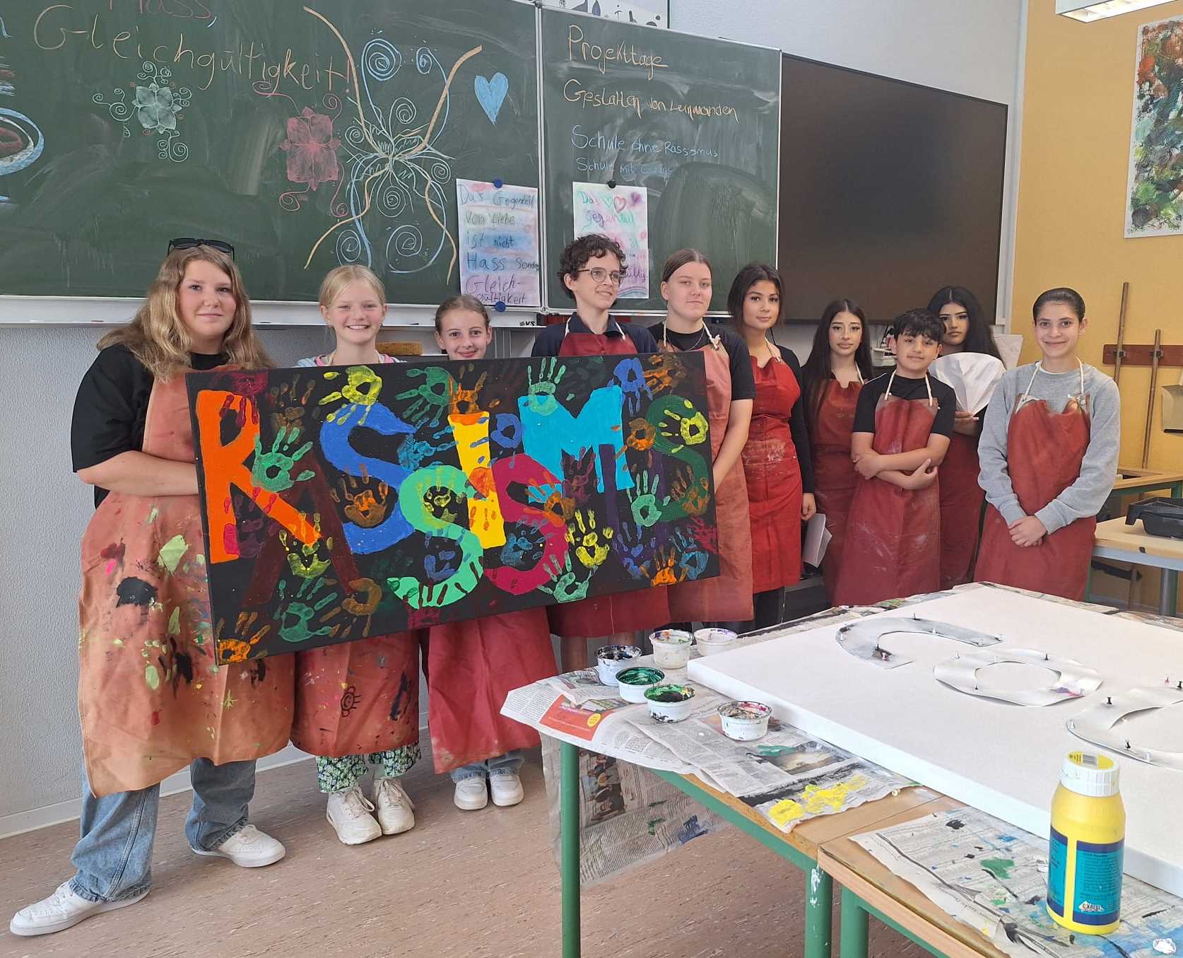 Projekt "Gestaltung Leinwand - WELTOFFENHEIT": Schüler*innen mit Freude an Werken und Kunst schufen nach dem gemeinsamen Bau eines Holzrahmens ein übergroßes Bild mit Acrylfarben auf einer Leinwand (l. Arbeitsphase, r. Ergebnispräsentation) |
