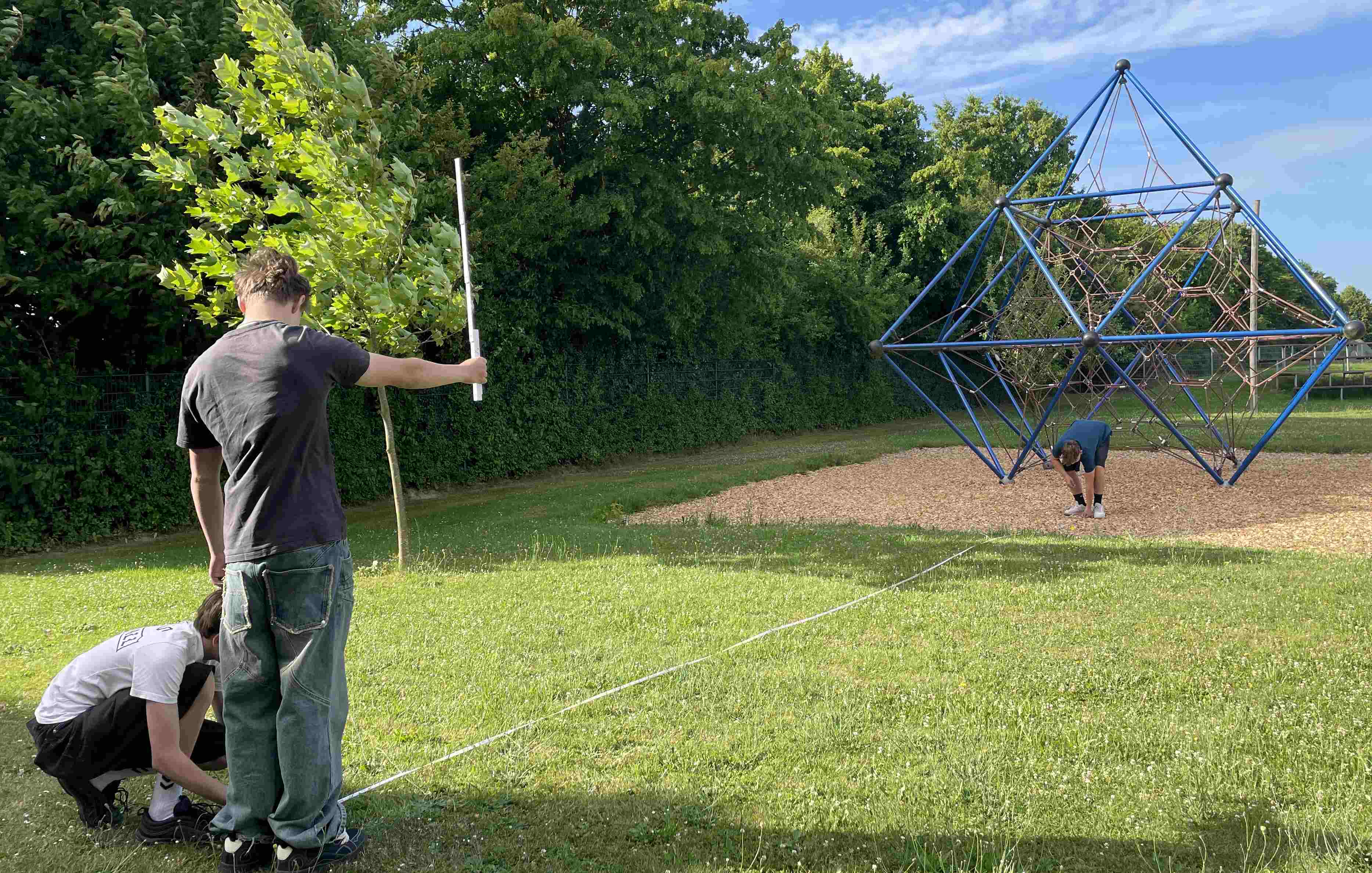 "Fortbildung SOL": Während der Projekttage bildeten sich sechs Lehrkräfte der Rhumetalschule im Bereich des selbstorganisierten Lernens (SOL) fort und bereiteten ihren Unterricht für das nächste Schuljahr vor. Ergebnis: In den kommenden fünften Klassen können unsere Schüler*innen in den Fächern Deutsch, Englisch, Mathematik und Physik an je einer Unterrichtseinheit teilnehmen, bei der sie die Aufgaben so bearbeiten, wie es ihre Interessen, ihr Lerntempo und ihre Fähigkeiten zulassen (Frau Müller testete vorab einige Inhalte: l. Höhenmessung am Klettergerüst, r. Höhenmessung eines Baumes). |