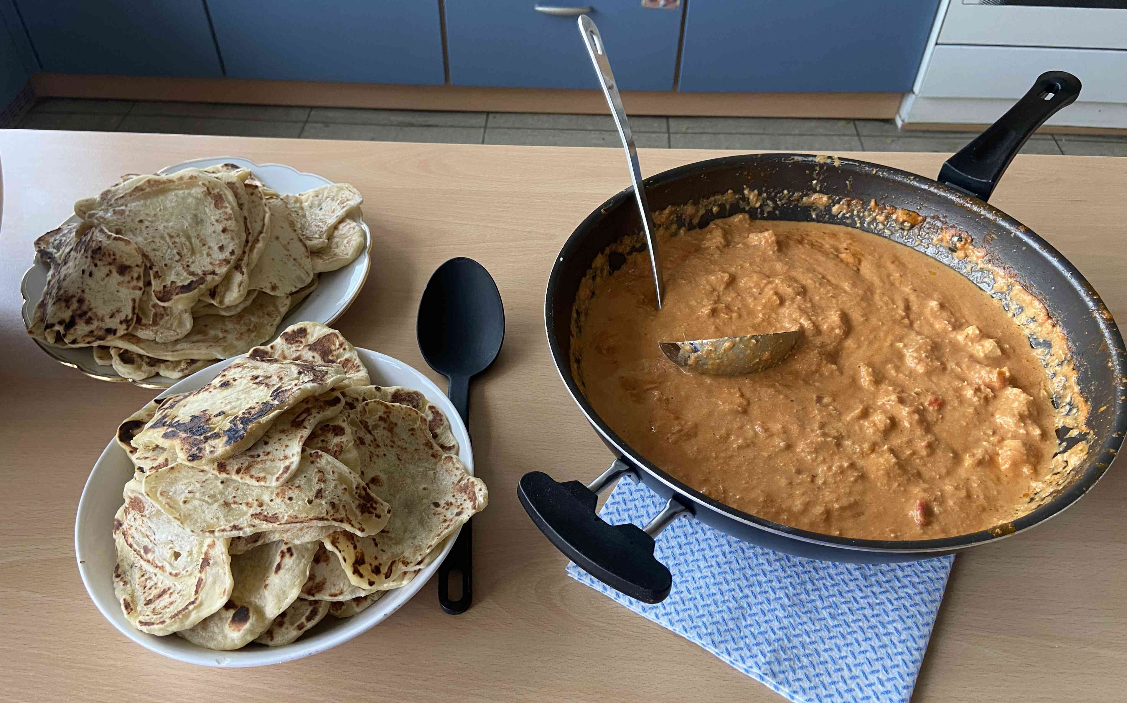 Projekt "Gerichte aus aller Welt": Die jungen Köche probierten Rezepte aus aller Welt und erstellten hierzu ein gemeinsames Rezeptbuch (l. Vorbereitung des Teigs für Pelmeni, ein russisches Gericht, r. Fertiges Produkt: Butter Chicken und Naan Brot aus Indien.). |